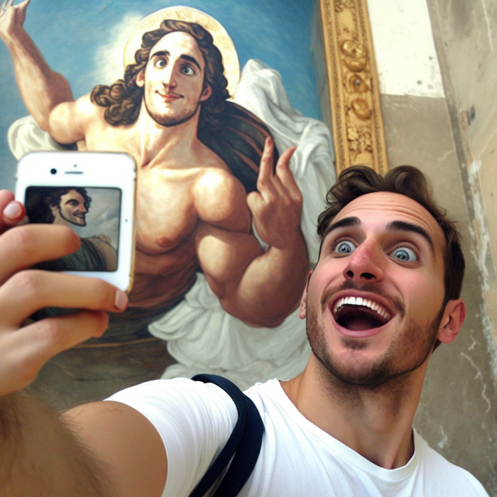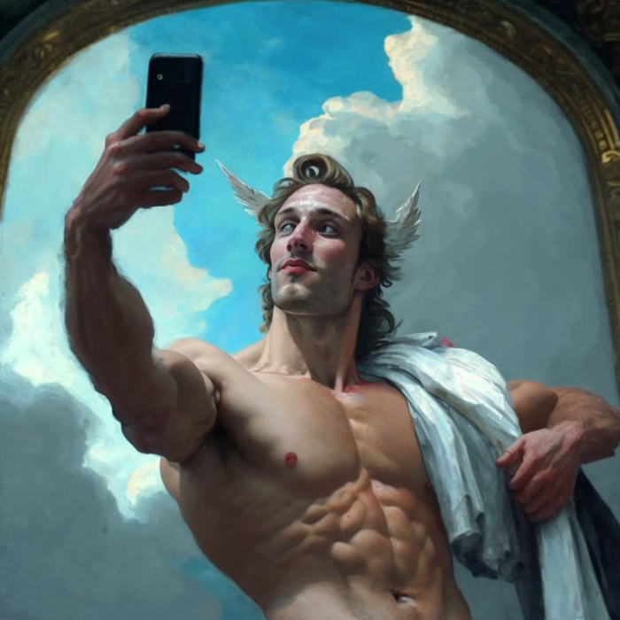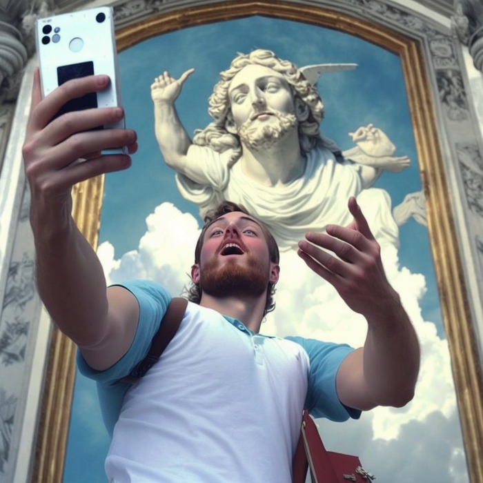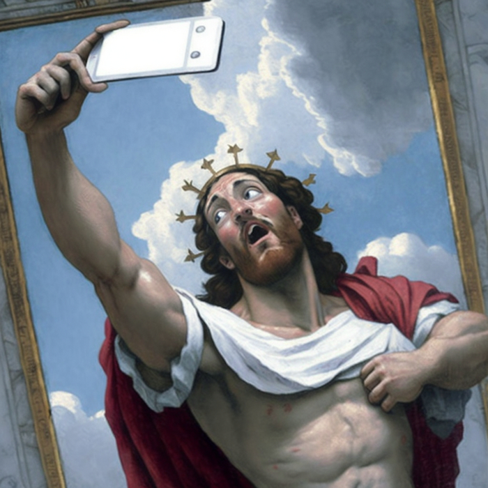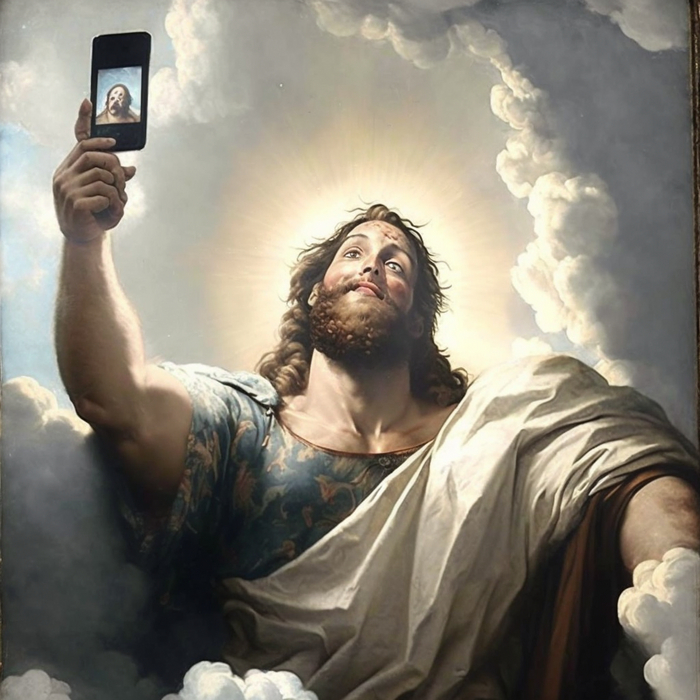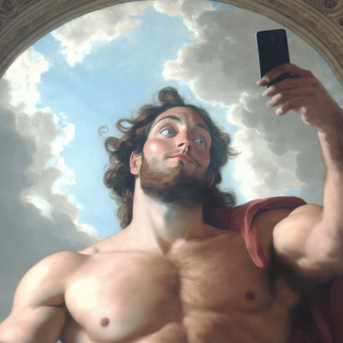 Промпт очень простой: "god's selfie". Все композиционные решения и сюжетные линии придуманы нейросетью Midjourney. От себя я ничего не добавляла.