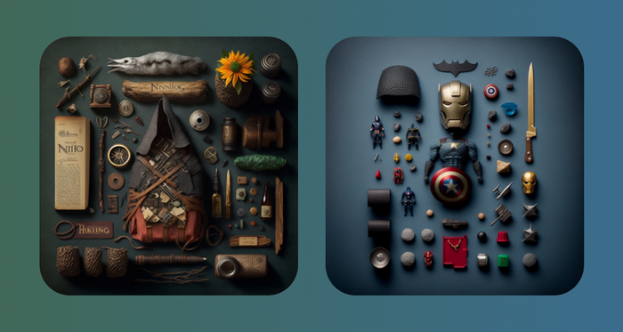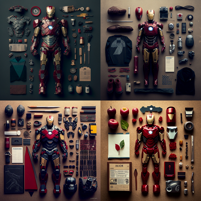При вводе запроса ключевым словом является Knolling. Если указывать наименование вселенной, то будет арт как в посте. Если указать конкретного персонажа, то может получиться его разложенная на детали фигурка. Например так:
