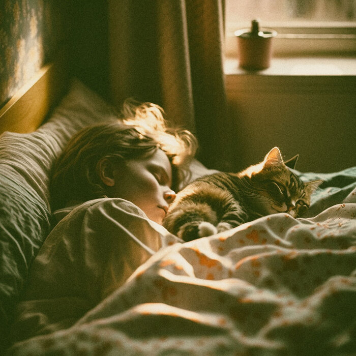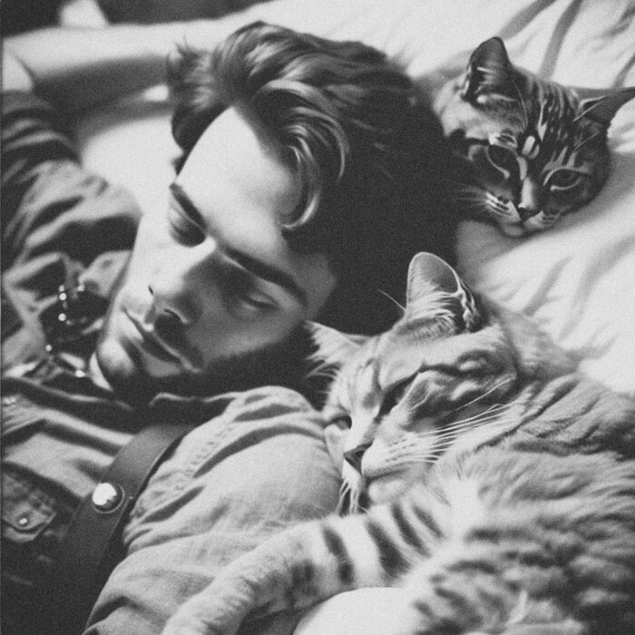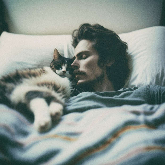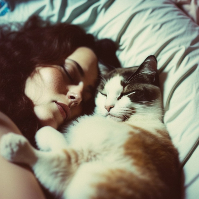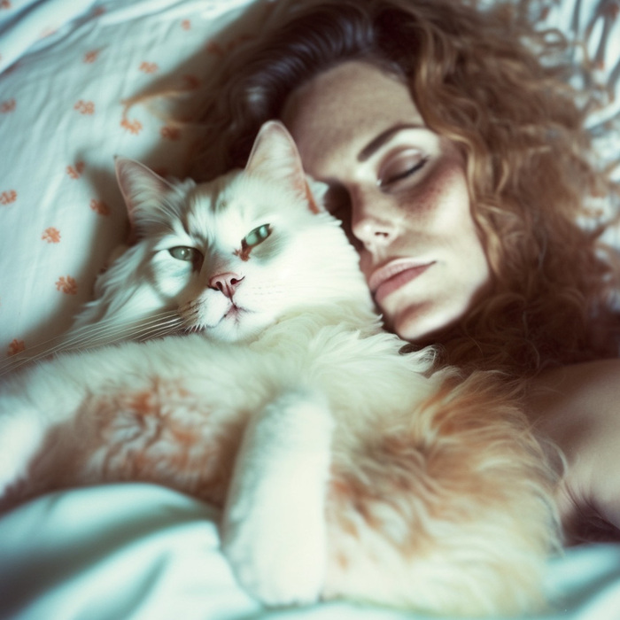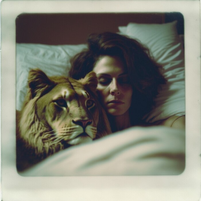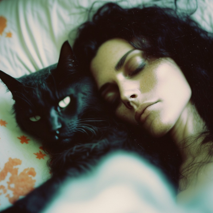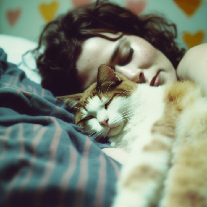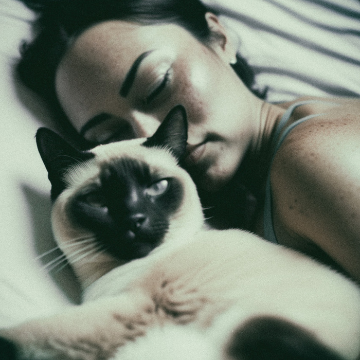 Пример запроса:Siamese cat sleeping on woman's belly in the bed, Polaroid, DSLR photography, 50 mm lens, F 1.2 Apperture, cat looking to the camera