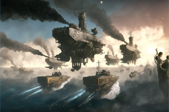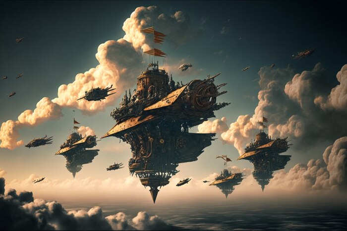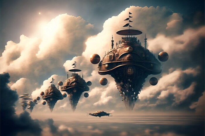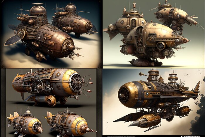 Поясню: как я и говорил в одном из предыдущих постов, у нейросети весьма угловатое восприятие одних и тех же запросов. Как бы я ни крутил промт про воздушный флот в стиле стимпанк, это ВСЕГДА БЫЛИ ДИРИЖАБЛИ. Крепости ли ты указываешь, крейсеры, или просто "корабли". Всегда одно и то же. Стимпанк? На тебе дирижабли.