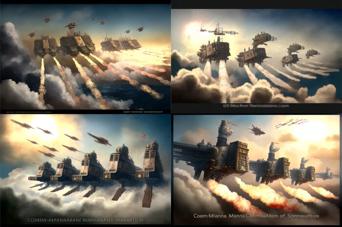 «Squadron combat steampunk air fortresses». (Эскадрилья военных стимпанк воздушных крепостей). Как видите, результат похож на ржавые бочки или игрушечные дирижабли.