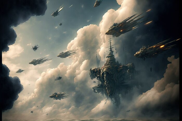 «Squadron of 6 combat airships::3 flying in the sky, matrix style, steampunk style, smoke, clouds, morning, general shot, highly detailed, realistic, --no dirigible» — Эскадрилья из 6 боевых воздушных кораблей летит в небе, стиль матрицы, стимпанк стиль, дым, облака, утро, общий план, высокодетализировано, реалистично, нет дирижаблей. Соотношение 3:2