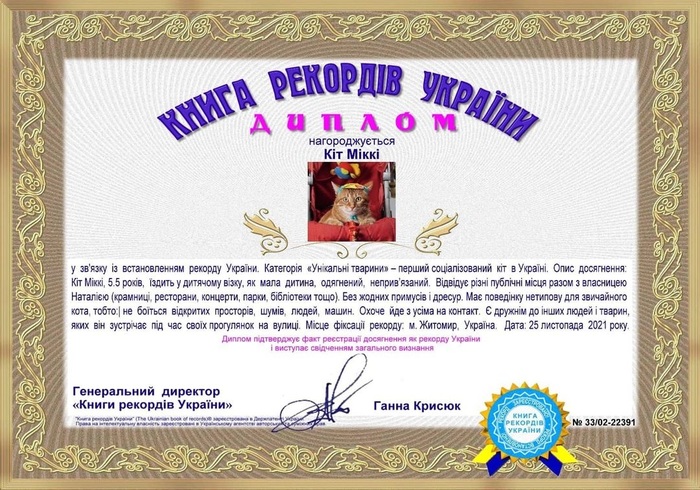 В итоге Микки стал рекордсменом Украины в категории Уникальные животные как Первый социализированный кот, и получил специальный диплом.