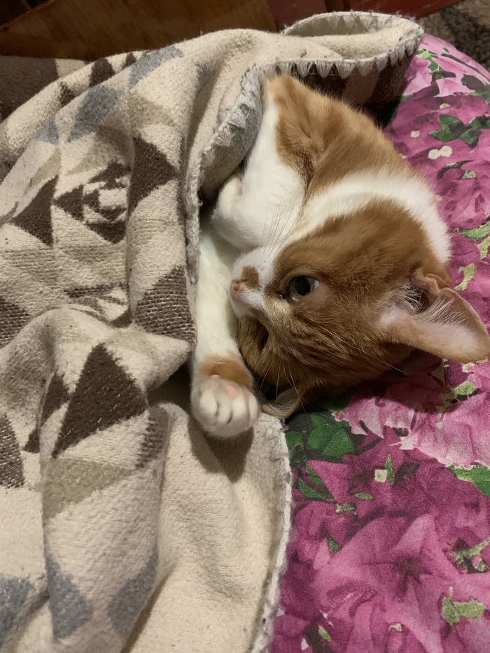 Зато хорошо спится моему коту, залез на кровать, лёг посередине между мной и мужем и спит, муж правда тоже спит, а вот мне не спится, пыталась заснуть - никак. Взяла телефон и решила сфоткать кота, темно, ничего не видно, включила вспышку, вроде получилось. Единственное пришлось обрезать фото, чтобы не было видно наших ног.