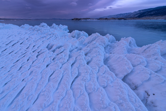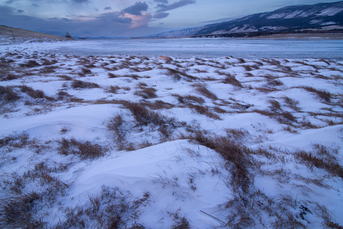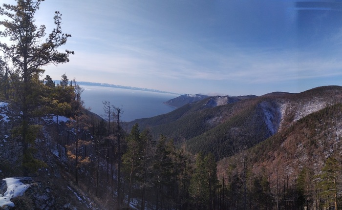 На противоположном берегу Байкала искрится снежными вершинами хребет Хамар-Дабан. К сожалению фото не передаёт всей глубины пространства.