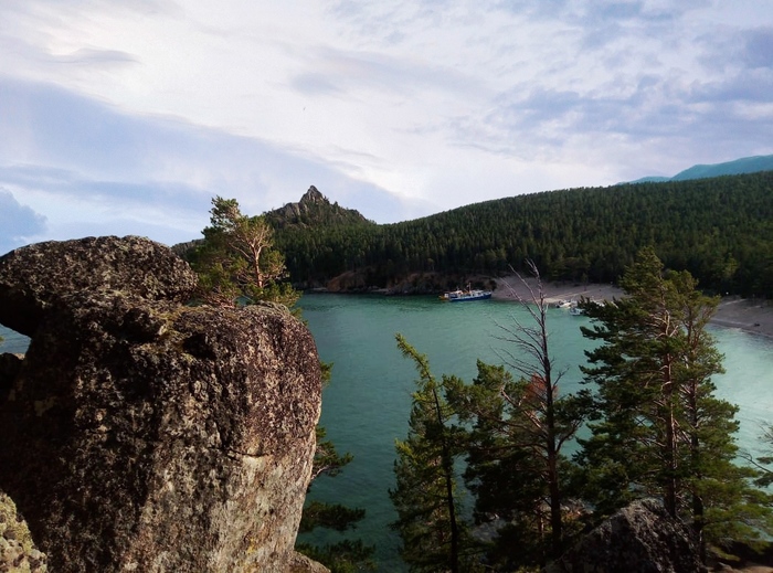Таких гранитных останцев в окрестностях довольно много, на снимке один из них видный с горы Спящий лев. Внизу видна трасса Р-258 «Байкал». /фото 19.09.2021 г./