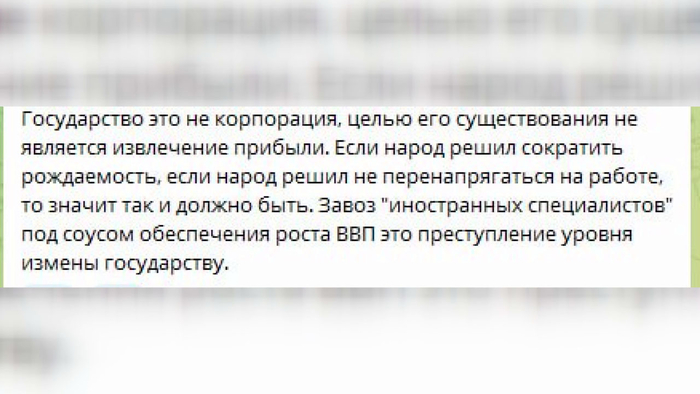 — Рожать не хотим и работаем с прохладцей. А развиваться хотим, зарплату хотим, чтобы страна процветала и была независимой. Так всё с экономики. А без трудовых ресурсов ничего не будет.