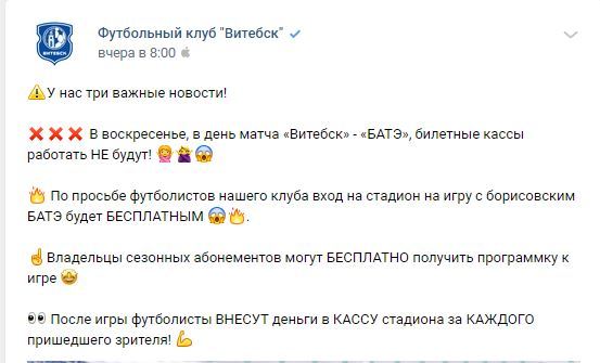 Сообщество футбольного клуба «Витебск» вывесило в группе «Вконтакте» объявление.