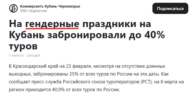 Не «8 марта и 23 февраля», как у всех нормальных людей. Не «мужской и женский дни», как у суконно-посконных и даже не «половые праздники», как у идиотских шутников, а именно гендерные. Тьхублядь на них три раза!