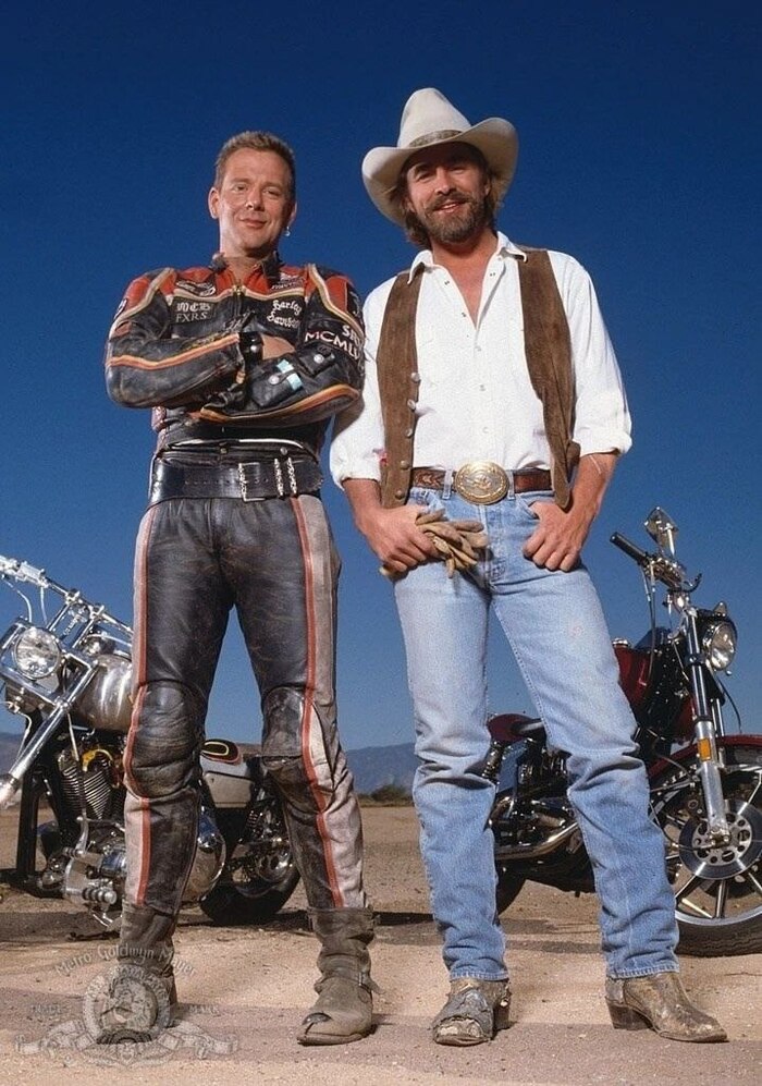 2) Микки Рурк и Дон Джонсон позируют для промо к боевику "Харли Дэвидсон и ковбой Мальборо" (1991). Занятно, что в нашей стране фильм имеет чуть ли не культовый статус (с соответствующей оценкой на Кинопоиске - 7.6) в то время как в Штатах его считают не слишком удачным боевичком непонятной категории (с соответствующей оценкой на IMDb -6.1). В фильме практически все персонажи названы в честь известных торговых брэндов: Харли Дэвидсон – мотоцикл, ковбой Мальборо – сигареты, Вирджиния Слим – сигареты, Джек Дэниэлс – виски, Олд Грэндэд – виски.