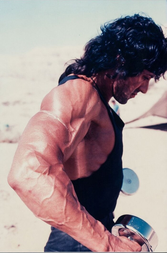 3) Сильвестр Сталлоне качающий мускулатуру в перерыве между дублями на закулисном фото со съёмок боевика "Рэмбо 3" (1988). В Книге рекордов Гиннесса 1990 года этот фильм называется самым жестоким за всю историю кинематографа, поскольку в нем насчитываются 221 акт насилия и свыше 108 смертей.