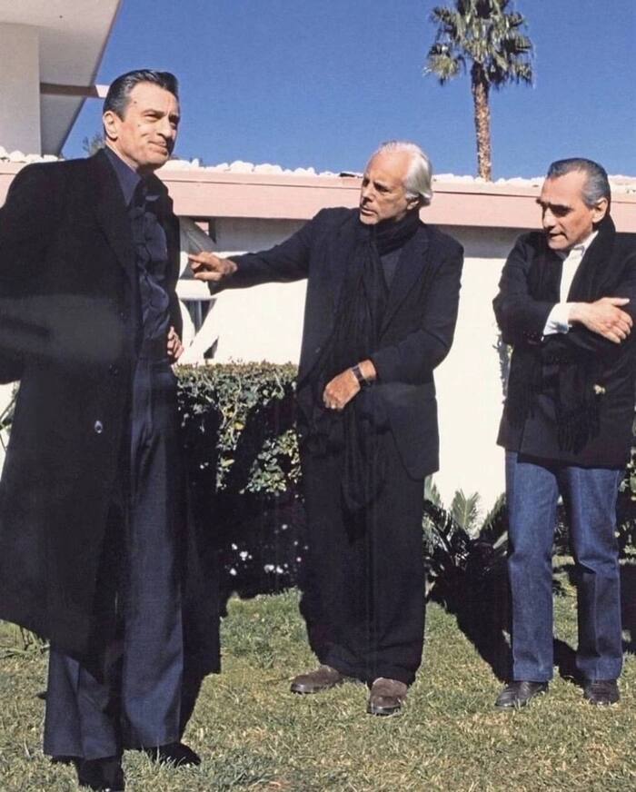 16. Для фильма "Казино" (1995), костюмы главных героев обошлись в $1 миллион. Роберт Де Ниро появлялся в кадре в 70 разных костюмах, Шэрон Стоун – в 40. Все костюмы после съёмок достались актёрам. На фото Джорджо Армани консультирует Роберта Де Ниро.
