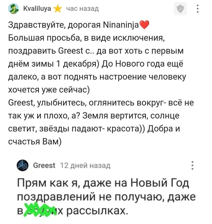 Официально перейдя в зимний режим, давайте для начала поблагодарим нашу незаменимую @Ninaninja за тёплый и чудесный ноябрь! Пожелаем ей не менее тёплого и волшебного декабря и хорошего отдыха! Ну и, конечно, поздравим всех причастных и не очень! )