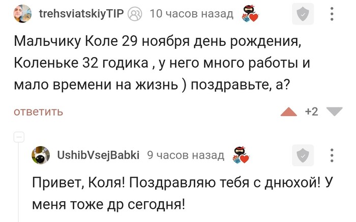 Дорогие ребята, поздравляю вас с днем рождения! Желаю вам безграничной радости, небывалого успеха, невообразимого богатства, а также самых щедрых начальников, самых смешливых друзей, самых тихих соседей, самых рельефных мышц в нужных местах и исполнения самых долгожданных мечтаний! Находите время для себя любимого, живите на грани тюленьства, будьте счастливы!