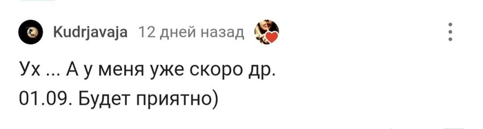 Но это не всё. У нас из компании с 29-ого августа у разных друзей подряд днюшки до 4-ого сентября. Это было трудно финансово и для здоровья. Теперь этого нет. Поздравляют меня в соцсетях, по смс и мессенджерам. Грустно. Ну ещё не вечер. Вроде...