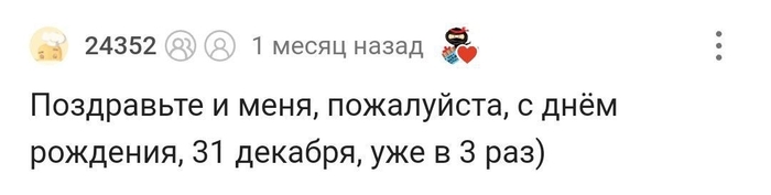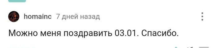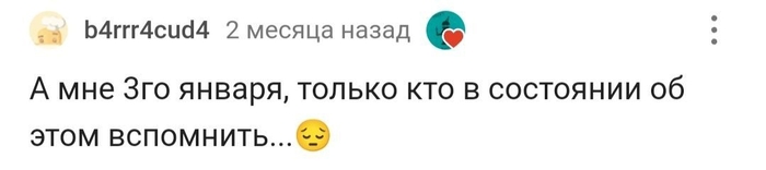 1 января мне исполнилось 35 лет. Я каждый год убеждаюсь, что я родился не в тот день. Меня с каждым годом поздравляет всё меньше людей. А в этом году, я даже не получил подарок от супруги и не получил от детей, так как она забыла им напомнить. Мама позвонила второго января и спросила, не хочу ли я что-то в подарок, но для меня это было как подачка, я конечно отказался. Меня только отец и сестра поздравили от чистого сердца, хоть живём в разных регионах. "Спасибо всем, кто меня поздравил". Мне только тут можно высказать свои мысли....