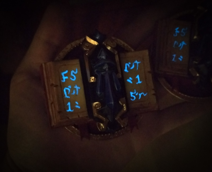 Почему же не сделать было и кристалл светящимся? Все просто: у меня крупнодисперсный люминофор БЕЛОГО цвета, а в темноте светится голубым. У меня вышел бы шершавый белый кристалл, а не гладкий и фиолетовый) Так что светятся только руны.