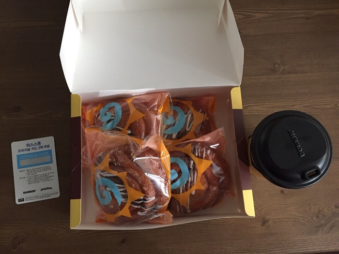 «В Южной Корее Dunkin’ Donuts в партнерстве с Hearthstone выпустили специальный набор из пончиков, кофе и 3 бустеров в подарок. Стоит такое удовольствие на наши деньги порядком 500 рублей.»