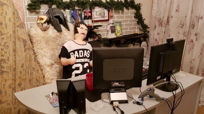 Стримить дома это супер, но каждому мужику нужен «гараж» для уединения от тягостей жизни. Для этого была выбрана пустующая комната у моего друга, которую я выклянчил «по-братски». Теперь нужно было ее облагородить, так как ремонт в этой комнате был еще при Сталине. Было принято решение просто «сделать» фон за стримером. Нахер то мне всю комнату ремонтировать. Мои первые стримы стартовали, прямо перед Новым Годом, так что сразу было понятно как украшать. Использованные вещи для топового фона: