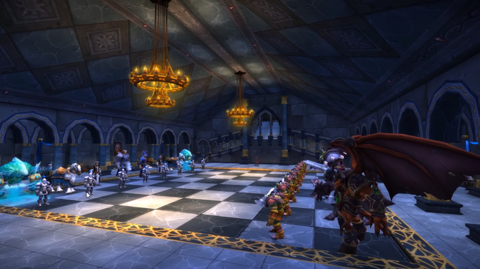 А в игровом зале обнаружилась огромная шахматная доска, уже с расставленными фигурами. Правда вместо обычных королей и пешек, роли фигур исполняли солдаты армии Штормграда во главе с королём Ллейном Ринном и орки-рубаки во главе с вождём Черноруком. Несмотря на жульничание эха Медива, партия была выиграна.