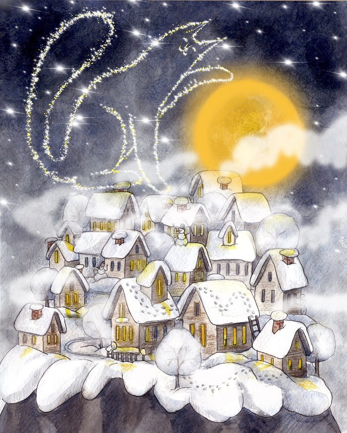 Улитка остановилась. Видимо, что-то услышала. И вдруг выпустила из себя какое-то облако. И это облако чудесным образом окрасилось в цвета неба и деревьев! Да так, что замок полностью исчез под этим покровом, приняв вид ёлок и облаков в синих небесах.