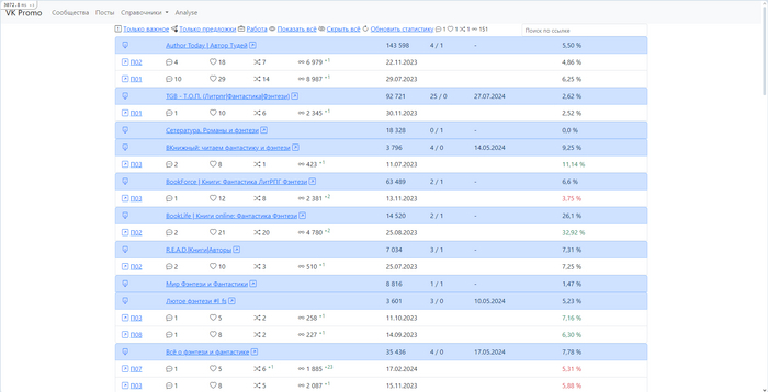 Видно, что в первой восьмёрке изменений нет, сообщества сохранили свои позиции даже после моего вандализма, а вот дальше практически все паблики сменили свои позиции. И уже исходя из этого списка можно примерно понять, в каких сообществах опубликованная предложка может быть замечена и у вашей книги появится новый читатель, а в каких такая возможность гораздо ниже.
