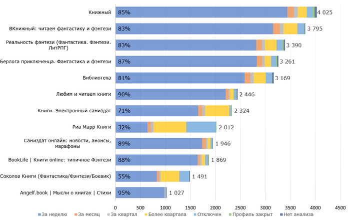 При этом на графиках хорошо видны группы, у которых процент "мёртвых душ" (голубая секция в правой части столбцов) достаточно высок. Как следствие, реальное число активных пользователей (и, как следствие, потенциальных читателей ваших книг) в этих пабликах будет ниже. Это, конечно, не отменяет необходимости размещаться и в них, но отдача от текстов будет ниже, чем в аналогичном по численности сообществе с более активным контингентом.