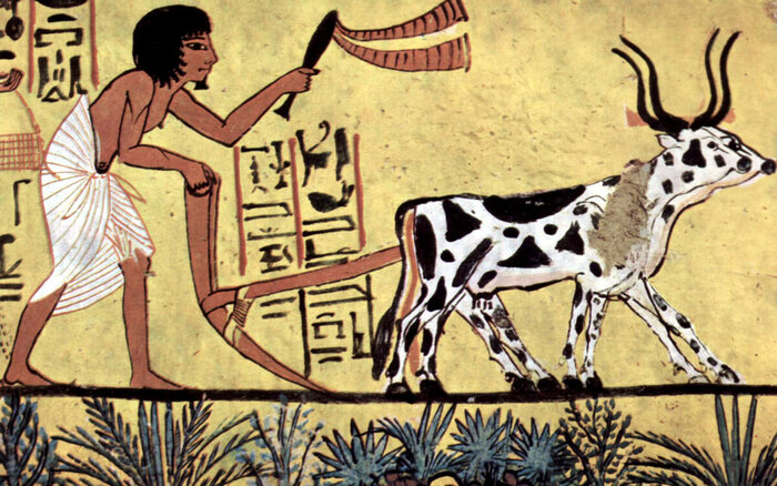 Именно на быках пахали древние египтяне и представители «крито-минойской» цивилизации (лошадей в тех местах ещё не водилось – не добрели ещё через Азию со своей родины, из Северной Америки, – да, именно так: установлено, что родина лошади – Северная Америка, как ни странно).