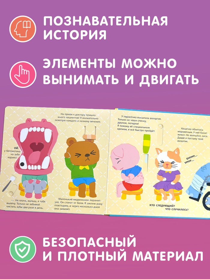 Хочешь лечить зверят, как настоящий доктор? Тогда открывай книжку, бери разложенные на страничках медицинские инструменты и принимайся за дело!
