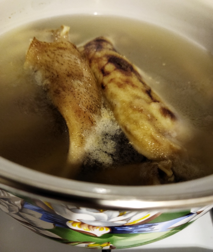 3. Сварил. Кожа с хряща слетает моментально пока горячая. Кожа разваливается и не вкусная и на выброс или на холодец, а вот хрящ не такой жёсткий получается. Для тех, кто любит хрящи - это находка. Но муторное занятие по очистке.
