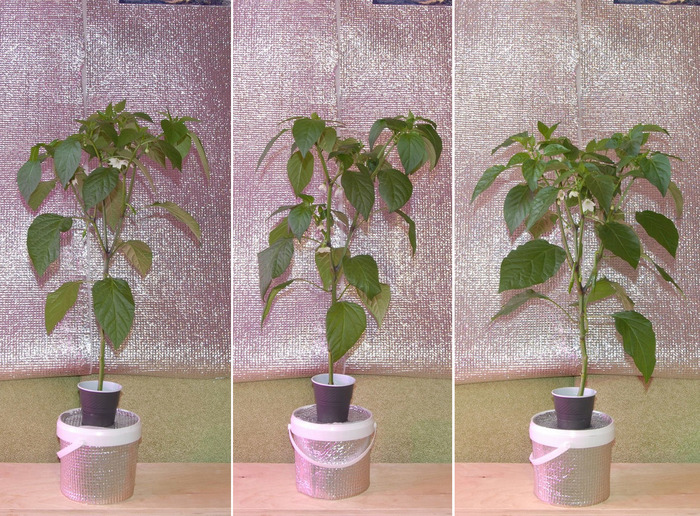 В таком виде всё это и стояло некоторое время, пока я не обнаружил водоросли в ведёрках. Хоть ведёрки и не прозрачные (белые), но видимо свет проникал сквозь них и этого хватило. Пришлось срочно всё помыть, поменять раствор и обернуть ведёрки остатками алюфома.