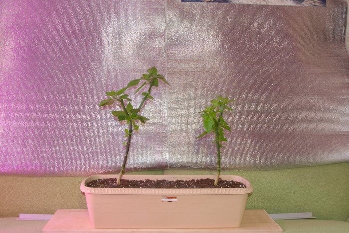 Позже, когда корешки вылезли снизу, переставил стаканчики в ведёрки из под сметаны/творога, объемом 1-1,2 л. Там уже стаканы не касались раствора, но корешки были в него погружены.
