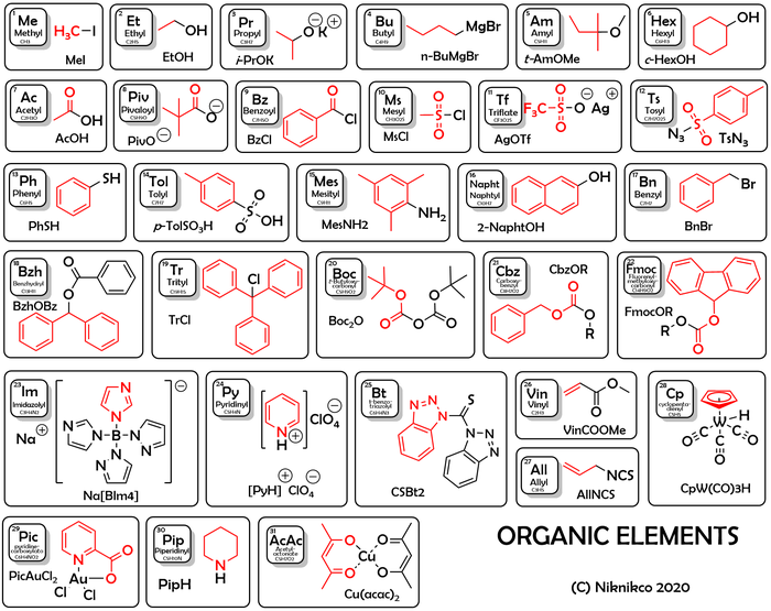Так появляются формулы в виде комбинации "органических" и обычных элементов, например, Cu(OAc)2 (и здесь Ас - это не актиний).