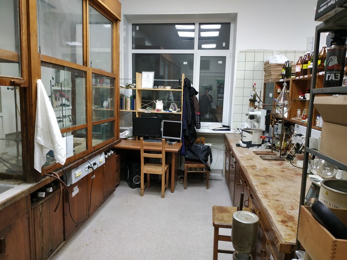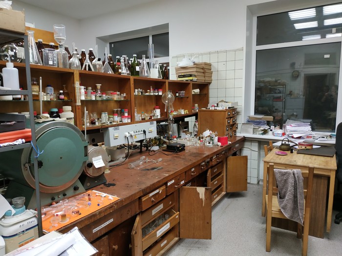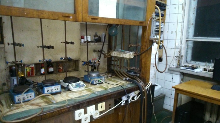 Слева видны два стареньких, но очень надёжных сушильных шкафа для лабораторной посуды после мытья (обычно моем сначала водой и ацетоном, большую часть грязи это убирает, в тяжёлых случаях приходится чуть запариться)
