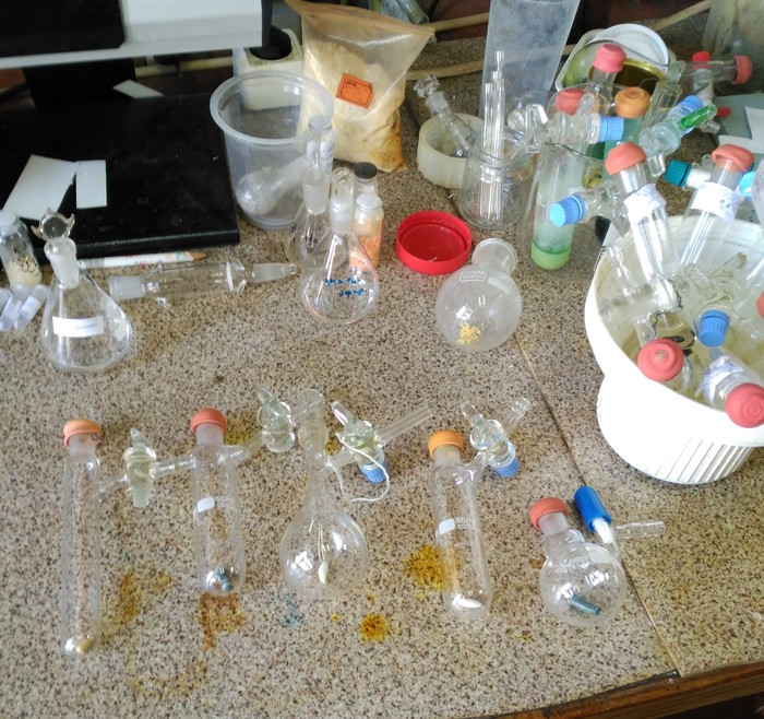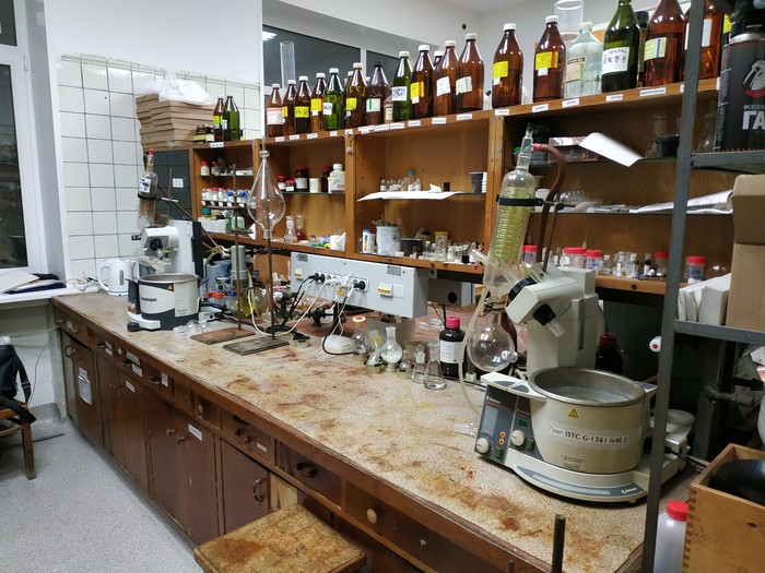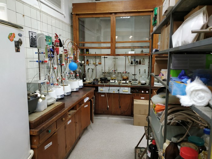 Правда в процессе моего рассказа я забыл упомянуть, что большую часть времени всё-таки отнимает органический синтез, поскольку молекулы-лиганды, окружающие металл в комплексе, тоже нужно получить, часто из самых базовых "строительных" блоков. Поэтому встречайте основное рабочее пространство. Это половина комнаты моих научных руководителей, компьютер спрятался справа за вытяжкой.