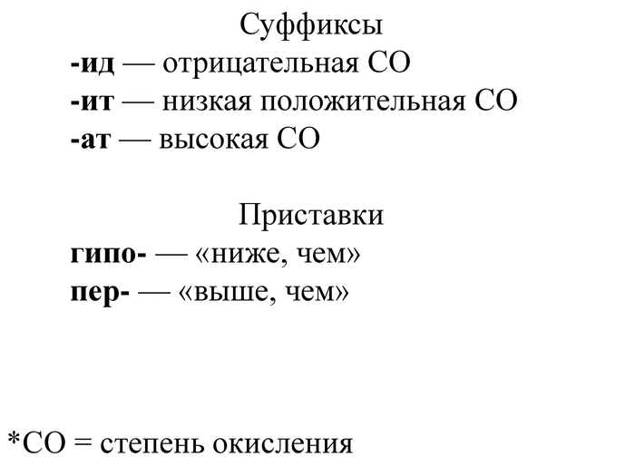 Для соединений, где образующие название атомы имеют более двух положительных степеней окисления, используются следующие суффиксы: