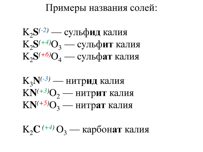 Если же соединение содержит более двух атомов, а в состав входит ещё и кислород, то название будет давать элемент, атом которого находится перед кислородом. И в зависимости от его степени окисления суффикс будет либо "-ит" либо "-ат". Или на примерах: