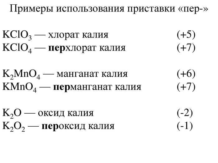 Также стоит сказать пару слов об особенности употребления приставки "пер-". Эта приставка употребляется, как правило, в двух случаях. Первый — это для обозначения элемента в степени окисления +7, а второй — когда нужно указать, что атом имеет не минимально возможную, отрицательную степень окисления. Так, например, кислород, который имеет минимальную степень окисления -2, может образовывать соединения, в которых его степень окисления будет равна -1. Так как -1 — это выше, чем -2, то мы вправе использовать приставку "пер-" и в таком случае у нас будет получаться пероксид.