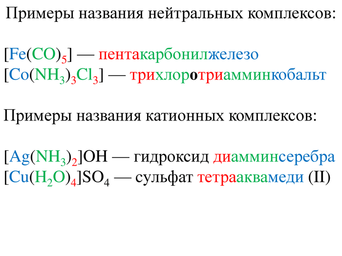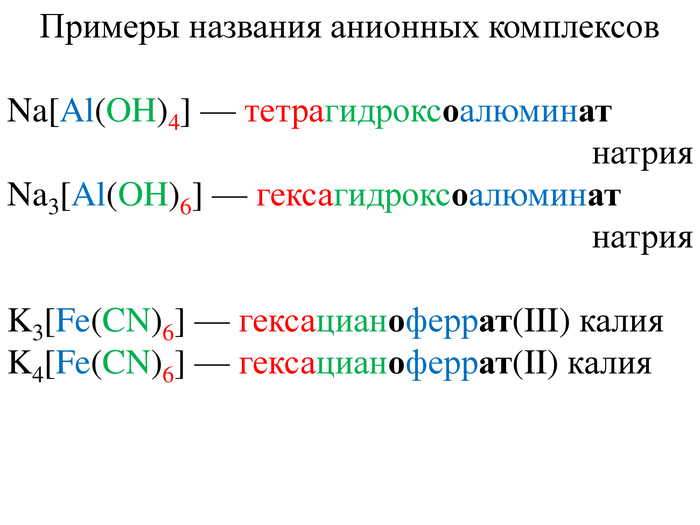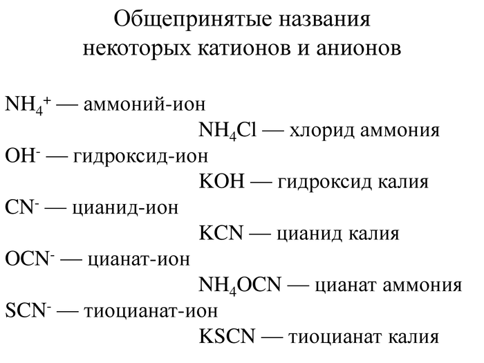 Также стоит знать названия части сложных катионов и анионов, которые невозможно назвать по приведённым выше правилам: