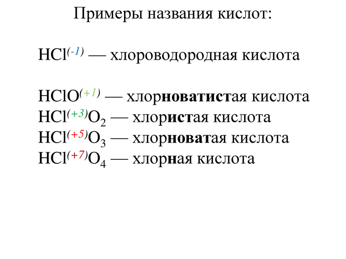 Теперь поговорим о названиях кислот. С ними немного интереснее. Для бескислородных кислот используется русский корень элемента и через соединительное "о" присоединяется "-водородная кислота". Для кислородной кислоты с атомами элемента в низких степенях окисления также используется русский корень и суффиксы "-ист-" или "-нист-", в высоких степенях окисления — суффикс "-н-"