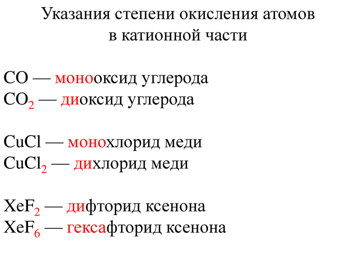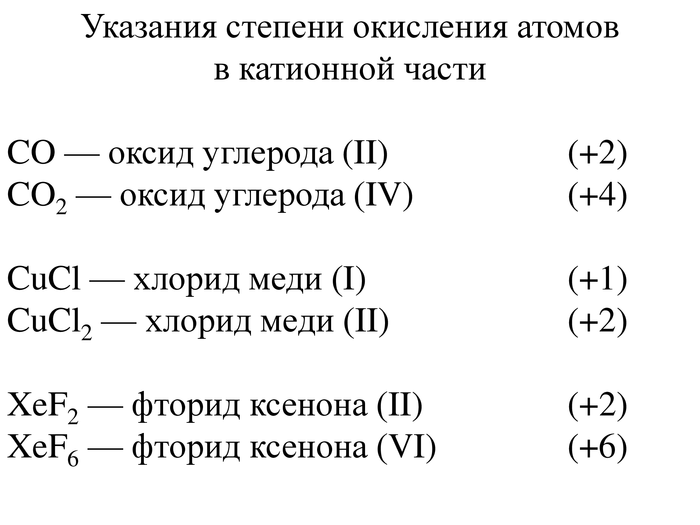 Зачастую катионы в соединении могут иметь разные степени окисления, поэтому, если для катиона такое возможно, в названии этого соединения после названия катиона в скобочках указывается его степень окисления римскими цифрами: