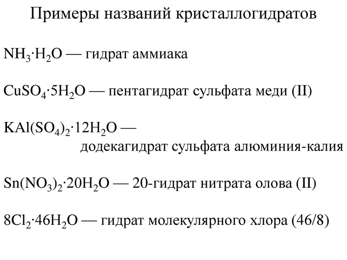 Если соединение является кристаллогидратом (то есть в своей кристаллической решётке помимо самого вещества содержится ещё и вода), то названия для таких веществ формируется следующим образом: