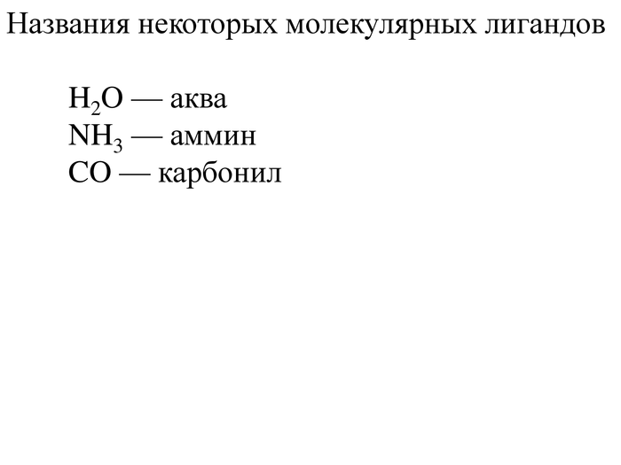 Здесь также необходимо запомнить как обозначаются в комплексных соединениях некоторые молекулярные лиганды (их на самом деле больше, но мы не будем вдаваться в экзотику):