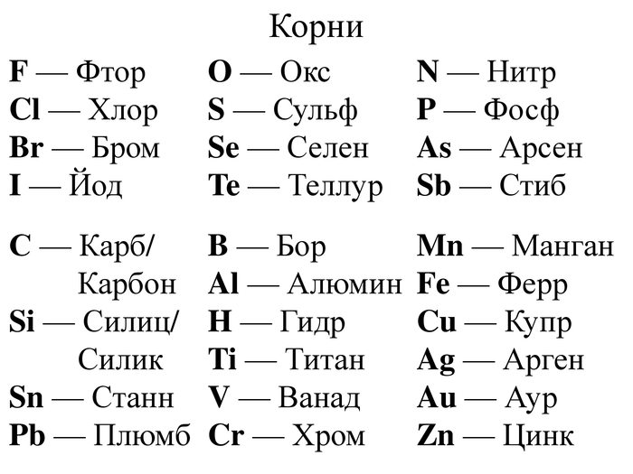 Итак. Названия химических соединений — это в любом случае слова и правила русского языка для них не чужды. А значит любое название имеет корень и может иметь приставки и суффиксы. Начнём с корней.