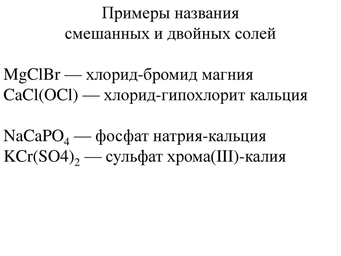 В двойных или смешаных солях названия катионов или анионов перечисляются через дефис:
