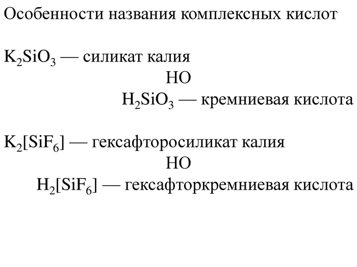 В названиях комплексных кислот, как и в названиях обычных, необходимо применять русские корни: