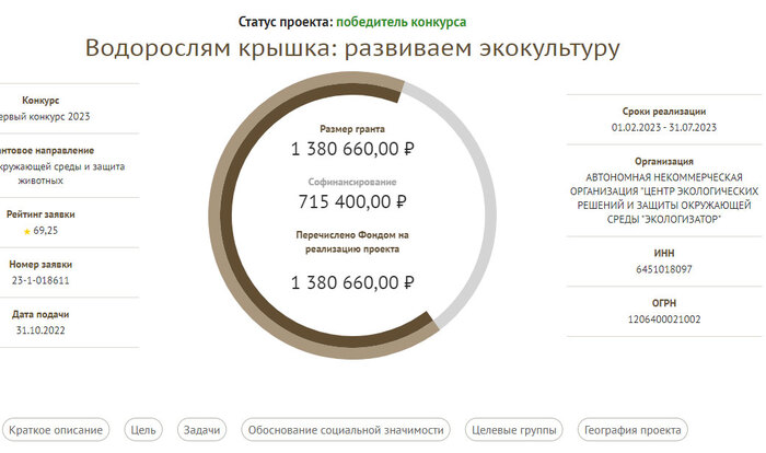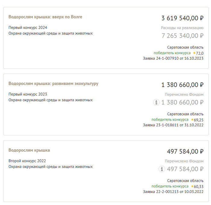 Про гранты пиарщик «Крышек» среди пустых словес нагло соврал: «…проект благотворительный, реализуемый… без использования бюджетных средств». Ага. Дураков ищите в зеркале, а я знаю, что даром, в обмен на рекламу, на сайтах вывешивают баннеры СМИ, а коммерческих организаций и фондов – за спонсорство. И президентский фонд экологизаторов поддерживает только нематериально? Ага. Вот как он их спонсирует, с каждым годом всё щедрее: