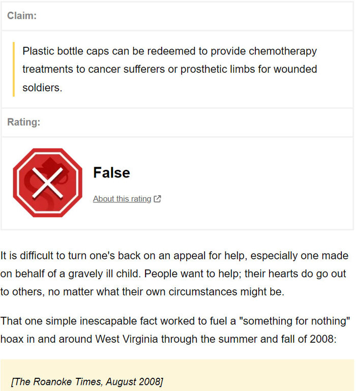 «В сети распространилось электронное письмо, в котором людям предлагалось собрать большое количество крышек от бутылок, которые можно было бы обменять на один курс химиотерапии для нуждающегося пациента. Когда это послание стало популярным, особенно в регионах Вирджинии и Западной Вирджинии, крупные корпорации, такие как Walmart, подключились к усилиям по сбору крышек. Копнув поглубже, стало очевидно, что это мистификация.