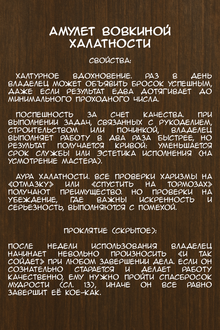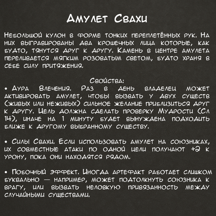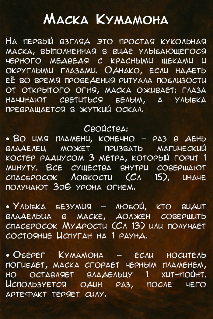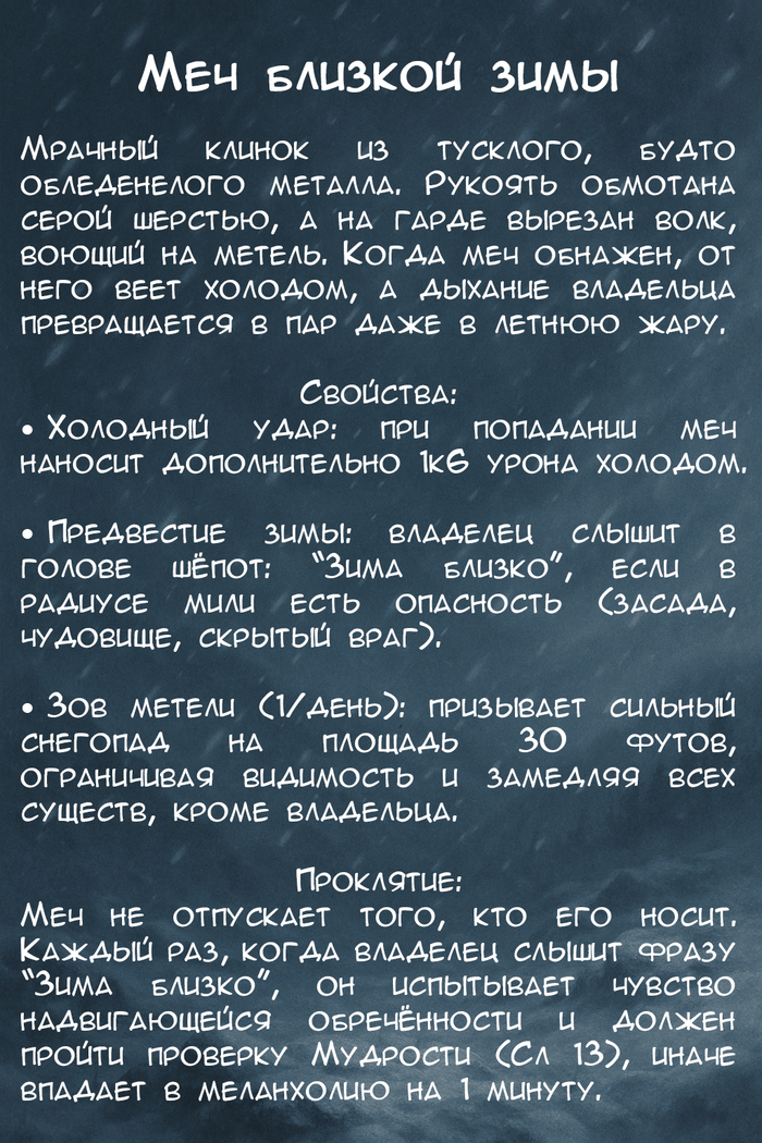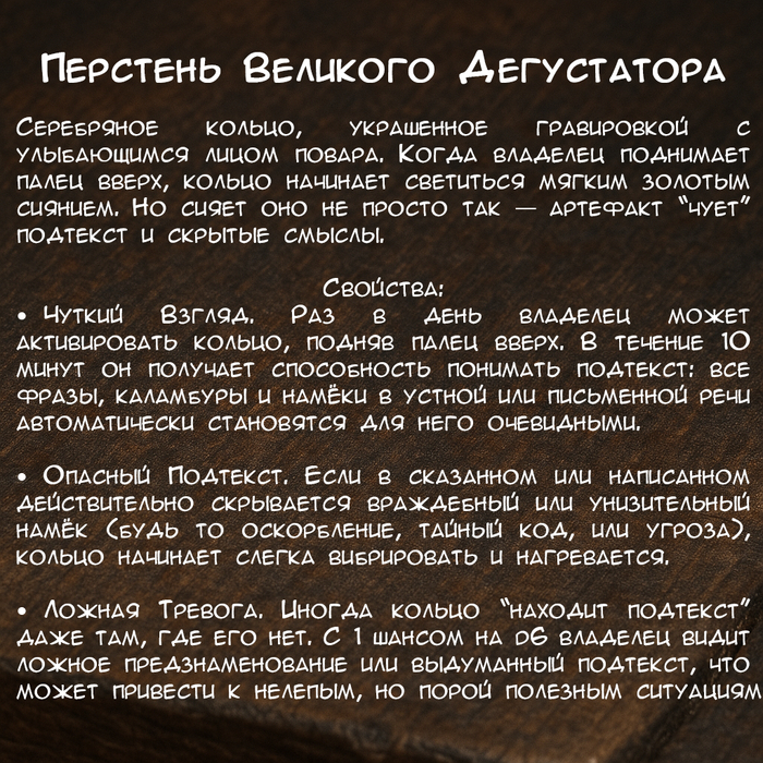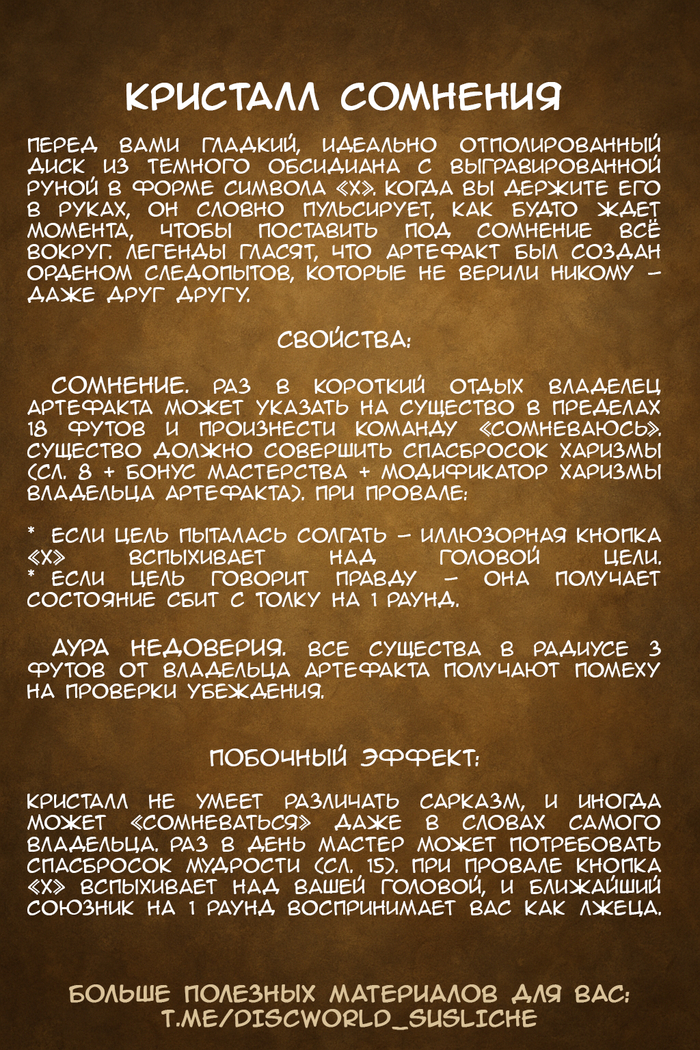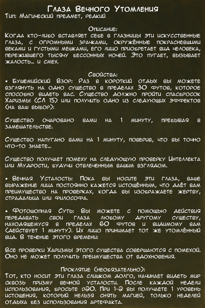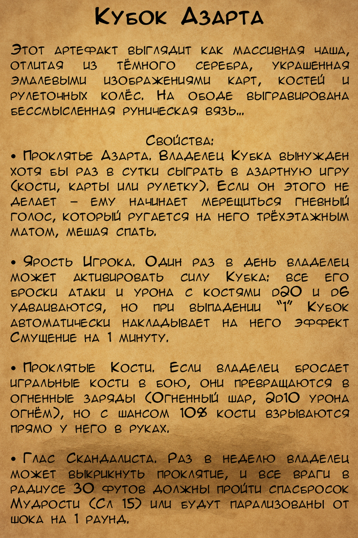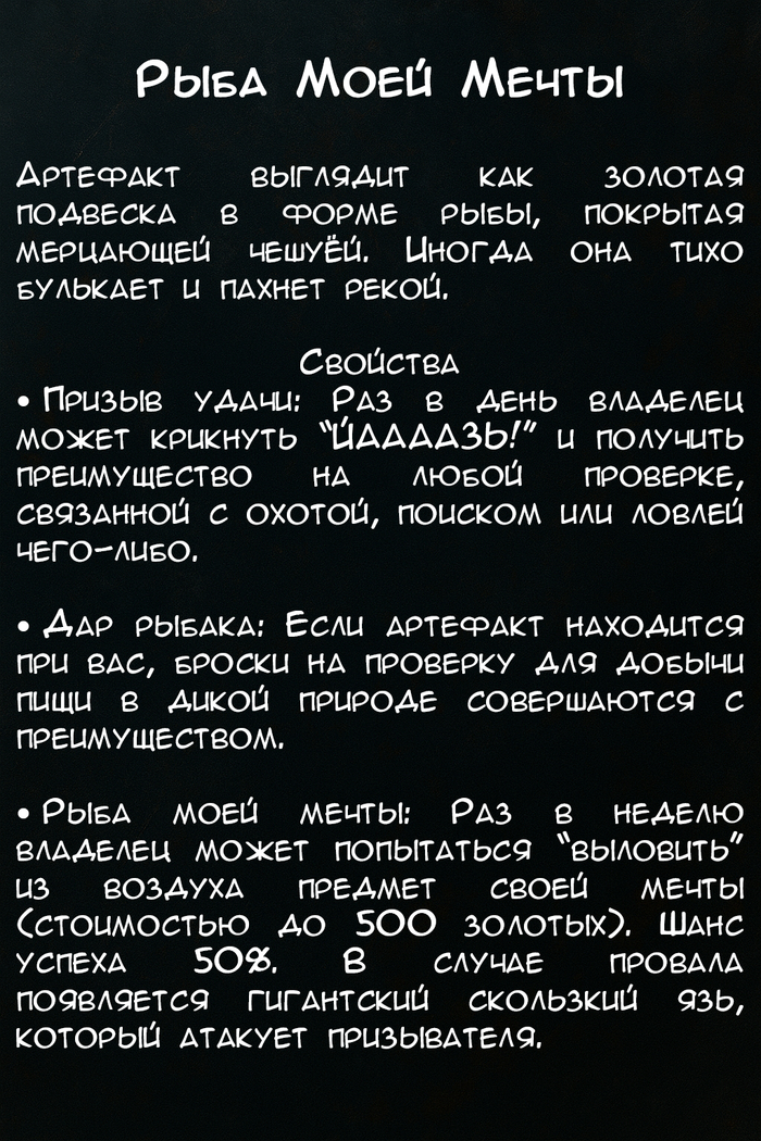 Я решил "поиграть со шрифтами" и переработал визуал и наполнение постов касающихся артефактов. В целом мне понравилось, добавилась рубрика по внедрению артефакта в игру. В дальнейшем думаю развивать эту тему и самый популярный артефакт недели обсудить в рамках небольшого подкаста с опытным мастером: разобрать возможные применения, грамотно вставить в сценарий игровой сессии, ну и конечно посмеяться от души!
