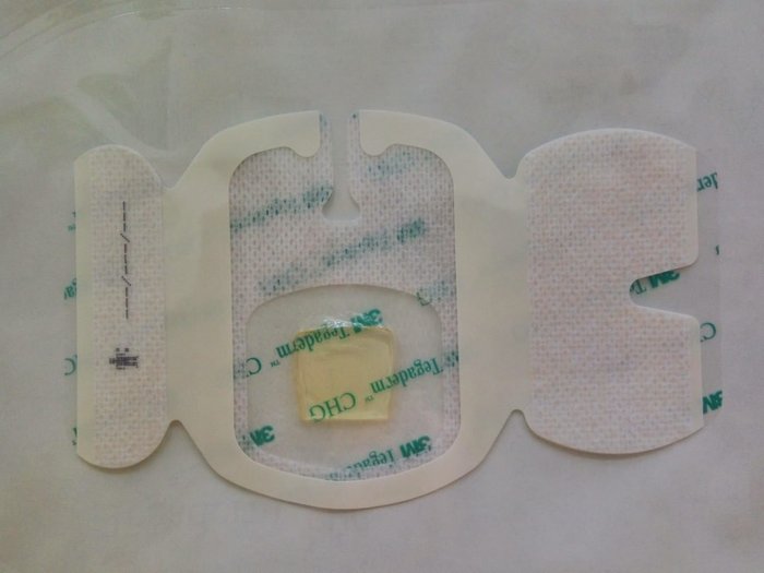 наклеили специальный пластырь размером с ладонь с хлоргексидиновой подушечкой по центру, которого хватает на 2 недели.